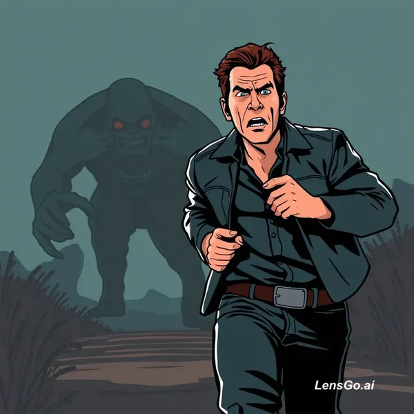 Digital art, GTA loading screen style, western comic book illustration, thick bold outlines, exaggerated facial expressions, [scene description: for example a scared man running from a monster], dark moody colors, vector style, 4k.