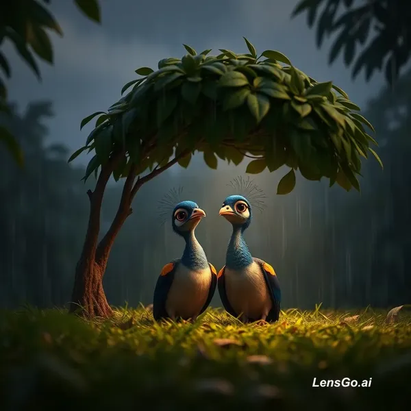 slow cinematic camera zoom toward two small baby peacocks sitting under a bush in the jungle, they look sad and slightly moving as if crying, light rain falling, leaves gently moving in wind, dark cloudy sky, emotional atmosphere, soft cinematic lighting, stable camera movement, 3D pixar style animation