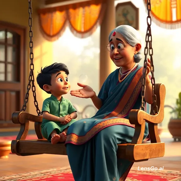 AI Image: "An emotional 3D animation of an Indian grandmother sitting on a wooden swing (jhoola) with her litt