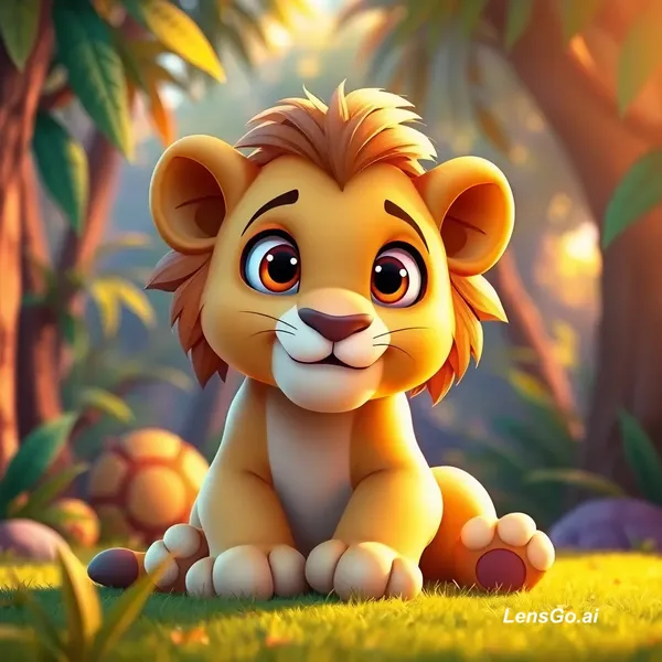 AI Image: 3D cartoon style cute baby lion sitting in colorful jungle, soft sunlight, big expressive eyes, chil