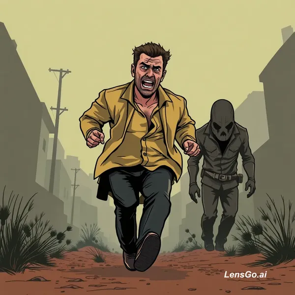 Digital art, GTA loading screen style, western comic book illustration, thick bold outlines, exaggerated facial expressions, [وصف المشهد: مثلاً a scared man running from a monster], dark moody colors, vector style, 4k.