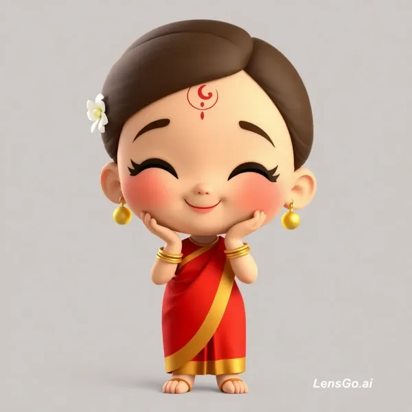 AI Image: Create a cute 3D chibi-style Indian girl character in full body. She is wearing a traditional red si