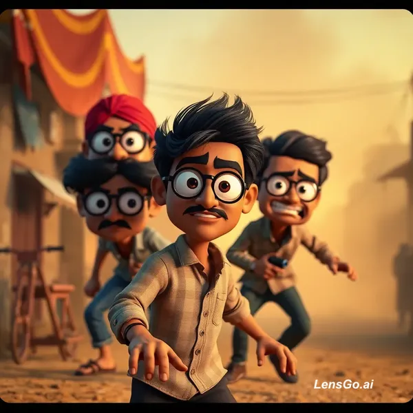 AI Image: 3D animated Indian comedy gangster movie, cinematic lighting, dramatic shadows, expressive cartoon c