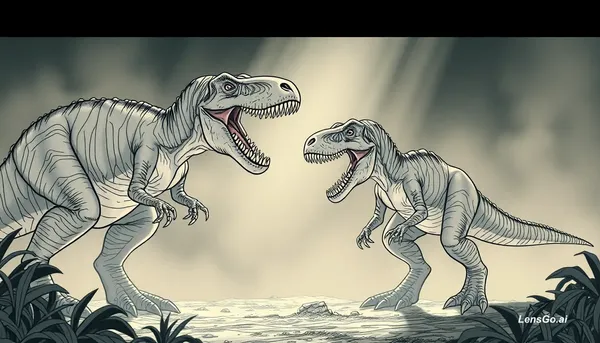 AI Image: create a coloring page of mortem rex versus indoraptor