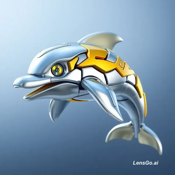 AI Image: Create a 3D Pixar style image of a transformer dolphin in silver, yellow and shiny show it to be ver
