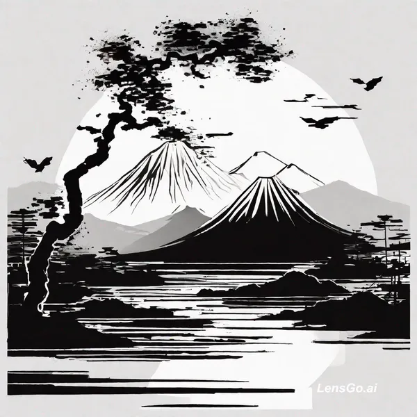 AI Image: Traditional Japanese sumi-e minimalism (gestural ink, negative space, organic bleed) Digital glitchc