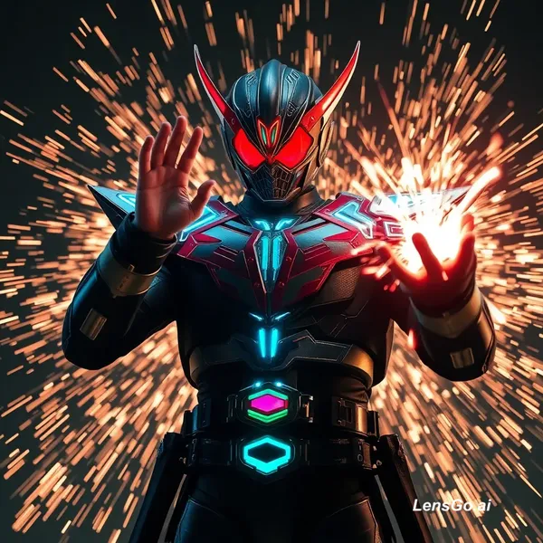 AI Image: The person in the reference photo activating a Kamen Rider transformation device. Energy waves explo