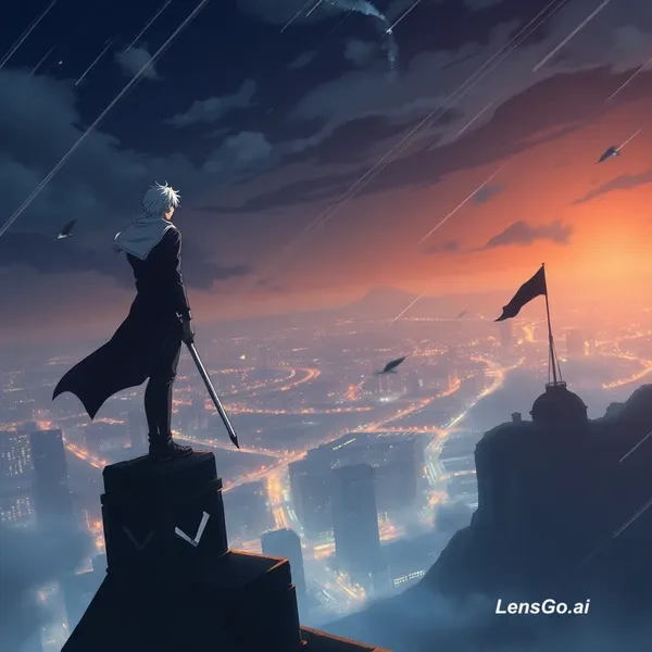 AI Image: Um guerreiro anime com cabelo branco em pé no topo de um prédio à noite, vento forte balançando o ca