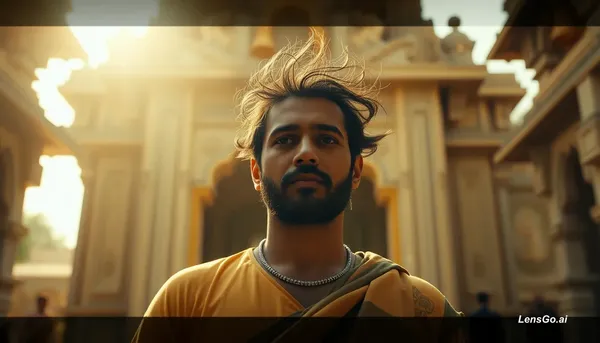 A cinematic romantic scene of an Indian man standing at a grand temple entrance, early morning soft sunlight, emotional and serious expression, slight wind moving his hair and clothes naturally, temple bells ringing in background, shallow depth of field, camera slowly zooming in towards his face, warm golden color grading, ultra realistic, 4K, dramatic lighting, emotional atmosphere, slow motion effect, soft background blur, highly detailed, Bollywood style romantic mood.