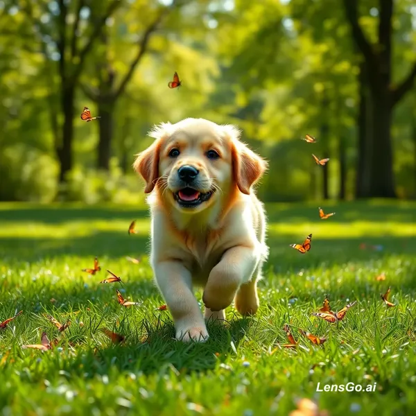 AI Image: A cute golden retriever puppy running in a green park, playing with butterflies, bright sunlight, ci