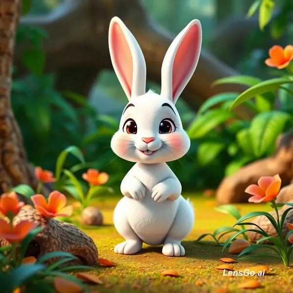AI Image: cute white rabbit cartoon, pixar style, jungle background, 3D cartoon, ultra HD