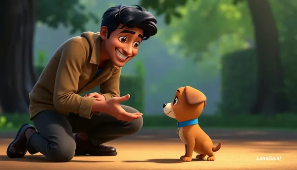 Arjun crouching with a warm smile, extending his hand toward the nervous brown color small dog, wearing a blue neck band. The dog hesitates, ears back, tail tucked, but eyes hopeful. style: 3d pixar.