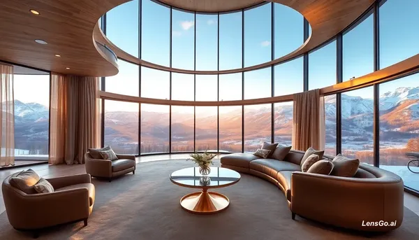 AI Image: Ultra-luxury modern mountain living room interior, curved panoramic floor-to-ceiling glass windows o