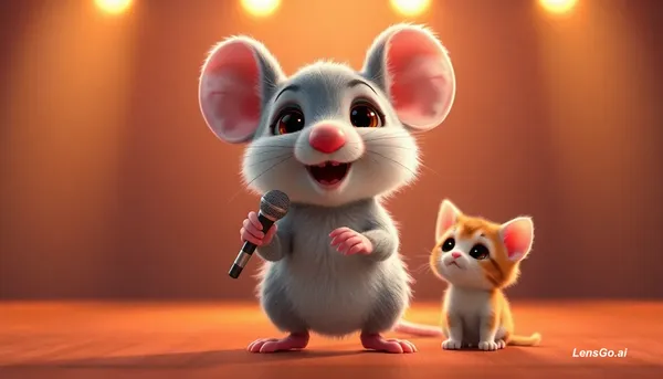 AI Image: Ultra cute 3D animated baby mouse standing on a stage, holding a microphone and singing happily, big
