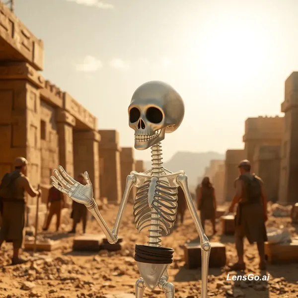Personagem: esqueleto humano animado, transparente, com cérebro visível Cenário: trabalhadores construindo pirâmides no Egito antigo, areia e pedras enormes ao redor, sol brilhando Ação: esqueleto falando diretamente para a câmera, gesticulando com as mãos, expressão animada Texto falado: "Você sabia que as pirâmides do Egito demoraram mais de 20 anos para serem construídas, e cada bloco pesava mais de 2 toneladas?" Estilo visual: cinematográfico, realista com toque de animação 3D, cores vivas,